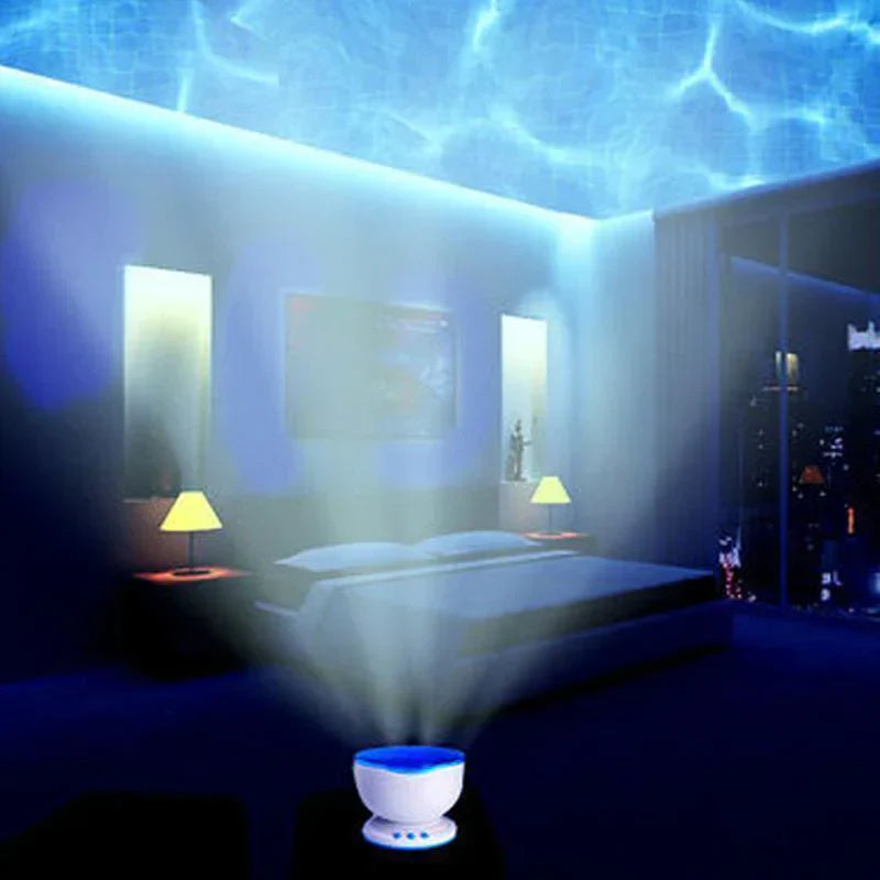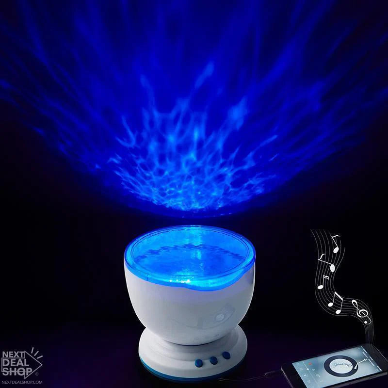 Assista as encantadoras ondas do oceano azul no seu teto e paredes. O Projector de ondas faz você sentir-se relaxado, enquanto também reproduz suas músicas favoritas para uma noite acolhedora!
